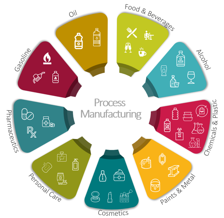 Examples of Process Manufacturing are Food and beverages ,Refined oil, Gasoline, Pharmaceuticals, Personal care products, Cosmetics, Specialty chemicals, Plastics, Metals, Paints, Alcohol |